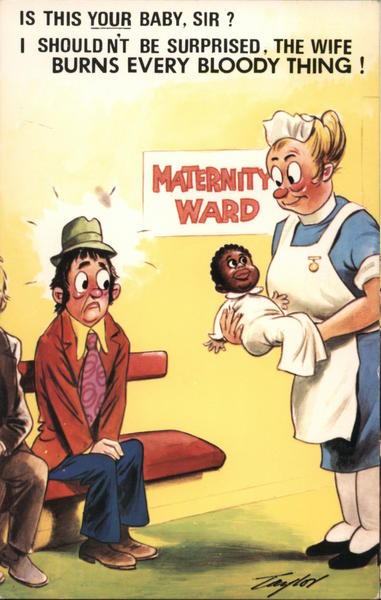 Front: IS THIS YOUR BABY, SIR ? I SHOULDN'T BURNS EVERY BLOODY THING! BE SURPRISED, THE WIFE MATERNITY WARD to Taylor Back: Published by BAMFORTH & CO., LTD., Holmfirth, Yorkshire "COMIC" Series No. 296 PREFERRED & Co OL Bamforth POST OFFICE