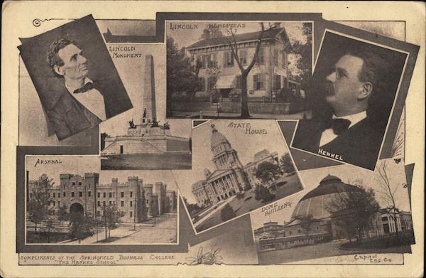 Front: ARSENAL 11111 LINCOLN MONUMENT #11 LINCOLN HOMESTEAD COMPLIMENTS OF THE SPRINGFIELD BUSINESS COLLEGE "THE HEKKEL SCHOOL IN JU HOUSE DOME BUILDING PLEASE HENKEL 37 Capitol Fl ễ nữ co Back: Post Cara. 450 5.-