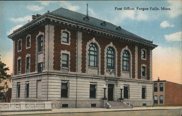 Front: ]] Post Office, Fergus Falls, Minn. 圓創設 06 Back: C.T. PHOTOCHROM. R-28433 DOSTA DOMESTIG THIS SPACE FOR ADDRESS ONLY.