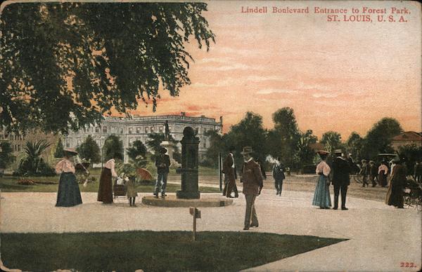 Front: CROF Lindell Boulevard Entrance to Forest Park, ST. LOUIS, U. S. A. 222. Back: Published by Erker Bros. Opt. Co. TWO CENTS