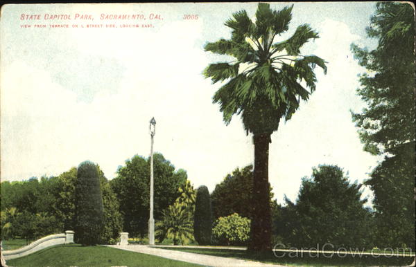Front: STATE CAPITOL PARK, SACRAMENTO, CAL. 3005 VIEW FROM TERRACE ON L STREET SIDE, LOOKING EAST, Back: AL BEAUTIES OF AMERICA. 25 This Space Reserved For Postmark This Space For Address Only