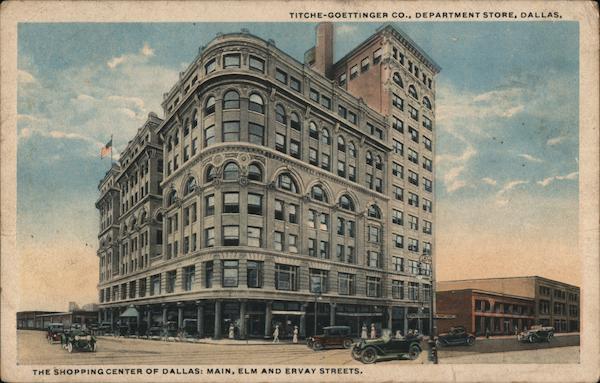 Front: TITCHE-GOETTINGER CO., DEPARTMENT STORE, DALLAS, THE SHOPPING CENTER OF DALLAS: MAIN, ELM AND ERVAY STREETS, ESGUEZ" 131877 AARA PAA RA Back: FREY POST CARD & NEWS CO., PUBLISHERS, DALLAS. Fost Card Ts Fost R-34172 üre HERE