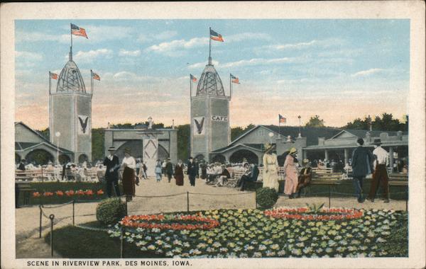 Front: SCENE IN RIVERVIEW PARK, DES MOINES, IOWA. CAFE Matias Back: MADE IN USA PUBLISHED BY HYMAN'S NEWS & BOOK STORE, DES MOINES, IOWA. T. AMERICAN 189 CHICAGO A-64854 AND ISLAND POSSESSIONS, CUBA, CANADA AND MEXICO FOR FOREIGN