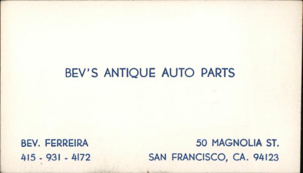 BEV'S ANTIQUE AUTO PARTS BEV. FERREIRA 415-931 - 4172 50 MAGNOLIA ST. SAN FRANCISCO, CA. 94123
