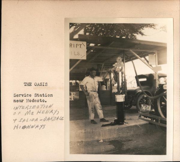 Front: THE OASIS Service Station near Modesto. INTERSECTION OF Ma HENRY, + SALIDA-OAKDALE HIGHWAYS RIPT ILS. FORDS SCRIP ACCEPTED VENTURA MOT 04 HOW ZEROLE $146-838 JEW Back: STAN.CO. ی 4 093 AMM