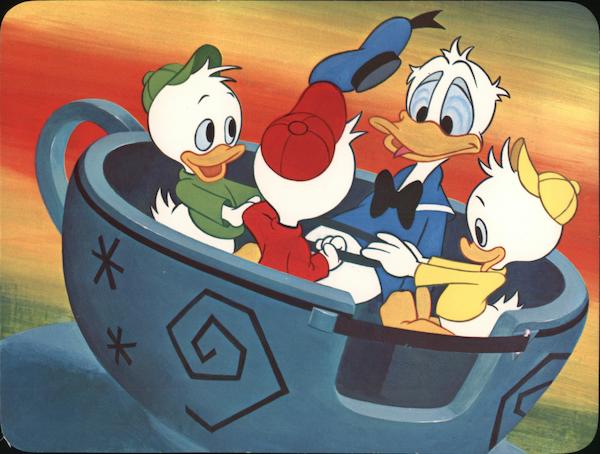Walt Disney World TEMPEST IN A TEACUP The wild whirl of the Mad Tea Party seems to be the perfect Fantasyland adventure for Huey, Dewey and Louie. But Donald Duck would prefer to sit the next one out, thank you. Disney PLEASE 0100-11901