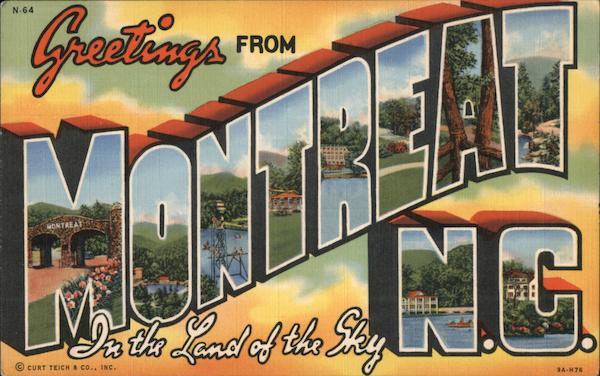 Front: N-64 Greettings Dis the Land of the Sky MONTREAT CURT TEICH & Co., INC. NG 9A-H76 Back: ASHEVILLE POST CARD CO., ASHEVILLE, N. C. "C.T. ART-COLORTONE" REG. U.S. PAT. OFF. HERE