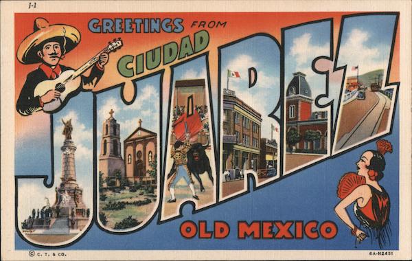 Front: J-1 CC. T. & Co. Famil GREETINGS FROM CIUDAD 301 BRAVO CHA OLD MEXICO 6A-H2451 Back: SANDOVAL NEWS SERVICE, EL PASO, TEXAS GENUINE CURTEICH-CHICAGO "C.T. ART-COLORTONE" POST CARD (REG. U.S. PAT. OFF.) PLACE