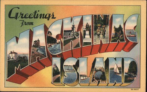 Front: Greetings 121 5A-H657 Back: G. H. WICKMAN, MACKINAC ISLAND, MICH. MADE IN U.S.A. GENUINE CURTEICH-CHICAGO "C.T. ART-COLORTONE" POST CARD (REG.U.S. PAT. OFF.) PLACE