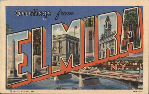 Front: GREETINGS from E!! OCURT TEICH & CO., INC. IDIO N.Y. mmmmm 2B-H1360 Back: ELMIRA NEWS CO., ELMIRA, N. Y. GENUINE CURTEICH-CHICAGO "C.T. ART-COLORTONE" POST CARD (REG.U.S. PAT.OFF.) PLACE