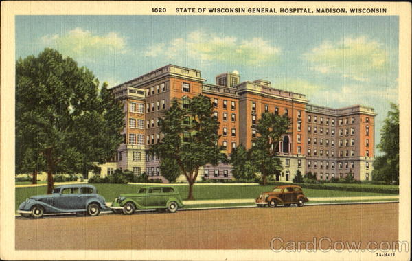 Front: 1020 STATE OF WISCONSIN GENERAL HOSPITAL, MADISON, WISCONSIN 7A-H411 国 世」 Back: "C.T.ART.COLORTONE REG.U.S. PAT. OFF.