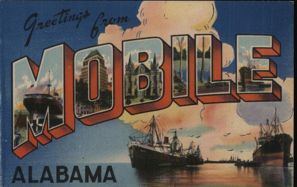 Front: Greetings from (₁ (1 MOBILE ALABAMA Back: Sold by Mobile Cigar and Candy Co., Mobile, Ala. 15,947 A COLOURPICTURE PUBLICATION, CAMBRIDGE, MASS., U. S. A. HERE