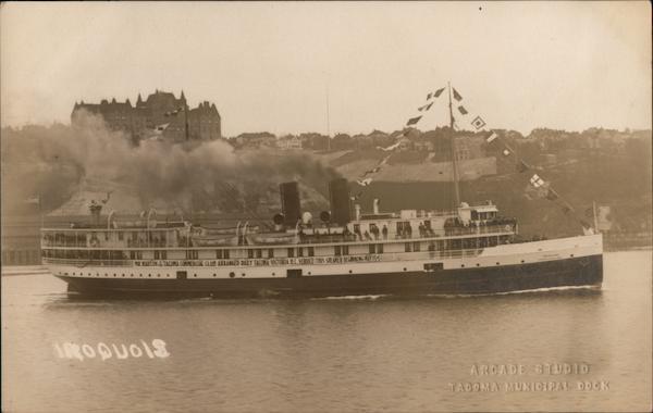 Front: MR MARTIN TACOMA COMMERCIAL CLUB ARRANGED DAILY TACONA-VICTORIA B.C. SERVICE THIS STEAMER BEGINNING MAY 15 IROQUOIS IROQUOIS ARCADE STUDIO TAGOMA MUNICIPAL DOCK Back: oldure aqЛОЯА 2000 JARIMUM AMODAT ΝΟΚΟ ΝΟΚΟ O