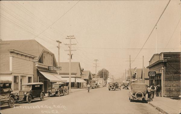 Front: HOBBS WALL & GO GENERAL MERCHANTS. In Crescent city, Salik PATERSON C2- 1|| SHOES HA CAF La CAFE CITY SODA ICE CREAM Back: on Cars: left Model T, DURANT + STAR 12.50 S