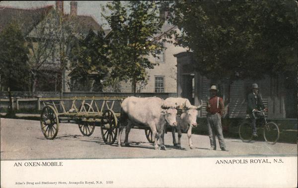 Front: AN OXEN-MOBILE Atlee's Drug and Stationery Store, Annapolis Royal, N.S. 1359 ANNAPOLIS ROYAL, N.S. Back: Warwick Bro's & Rutter, Limited, Publishers, Toronto 1979.09 LA LARK AND U.S. ABROAD.