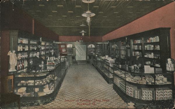 Front: Hi *** Interior of Keeling's Drug Store Rockford. Tit. EEE 51 DDDIN S Back: FOREIGN. TWO CENTS