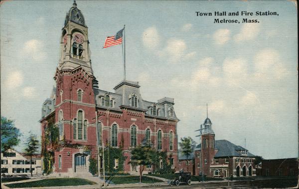 Front: 11 Town Hall and Fire Station, Melrose, Mass. A A Back: For Correspondence only We cau MELA 9-30P SE is clock on this MASS building from the back porch. R.L.B. 2. to OST ARD 256 Miss E. E. Barter 41 leak St. Providence R.J