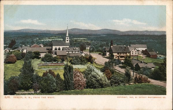 Front: 8786. DUBLIN, N. H., FROM THE WEST. 115 COPYRIGHT, 1905, BY DETROIT PHOTOGRAPHIC Co. Back: AND CANADA, FOREIGN, Two CENTS.