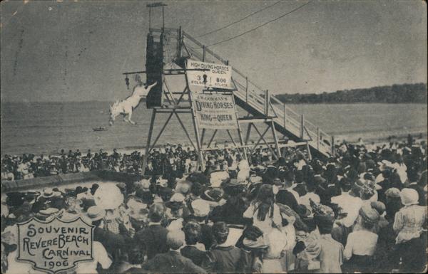 Front: SOUVENIR REVERE BEACH CARNIVAL 1906 HIGH DIVING HORSES. QUEEN OCLOG 8-00 OCLOCK J.W.GORMAN'S DIVING HORSES 700 KING QUEEN Back: 14 for this country. 24 for foreign. най Andici Canan Cabely