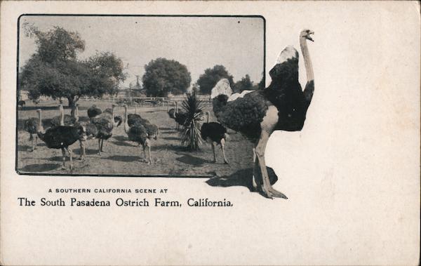 Front: A SOUTHERN CALIFORNIA SCENE AT The South Pasadena Ostrich Farm, California. Back: wilt TWO CENTS.