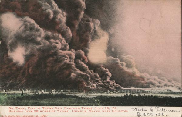 Front: OIL FIELD, FIRE OF TEXAS Co's. EARTHEN TANKS, JULY 28, '05 BURNING OVER 28 ACRES OF TANKS, HUMBLE, TEXAS, NEAR HOUSTON. E. C. KROPP, PUBL, MILWAUKEE, NO. 1927 www. Willa & Fellman 8. ccc ist, Back: Post-Gard TWO CENTS