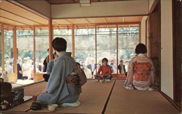 The ancient ritualistic chanoyu (tea ceremony) being performed by Miss Eiko Takahashi for honored guests in the tea house in the Japanese Gardens