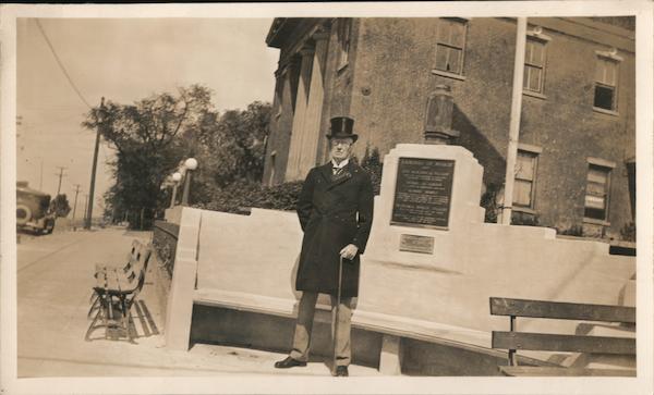 There's a plaque pictured on the stone behind the man but the text is unreadable