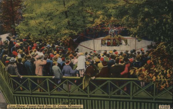 Front: 0712 Lion Show, Forest Park Zoo, St. Louis, Missouri (215) 11 KA 17100 Back: SOLD BY GIBSON MERCHANDISE CO., ST. LOUIS, MISSOURI ACOLOURPICTURE" PUBLICATION, BOSTON 15, MASS., U. S. A. HERE