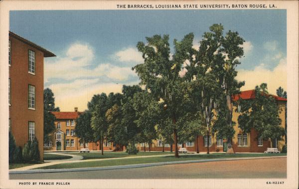 Front: PHOTO BY FRANCIS PULLEN THE BARRACKS, LOUISIANA STATE UNIVERSITY, BATON ROUGE, LA. 6 A-H2247 Back: HARRIS NEWS AGENCY, BATON ROUGE, LA. "C.T. ART-COLORTONE" REG. U.S. PAT. OFF. MADE ONLY BY CURT TEICH & CO., INC., CHICAGO HERE