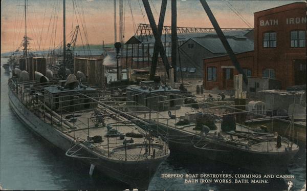Front: BATH IRON TORPEDO BOAT DESTROYERS, CUMMINGS AND CASSIN. BATH IRON WORKS, BATH, MAINE. Back: A-45981 PHOTOCHROM ROST 3,50 DOMESTIG Mir Fibrence A Moose 14 High St Belfast Me