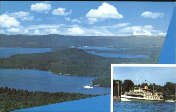 View form Cedar Mountain at Alton. New Hampshire, Showing The M. V. Mount Washington Excursion Boat on one of her Two daily Trips around Lake Winnipesaukeee. The Town of Wolfeboro and The Ossipee Mountain Range are seen in Background.