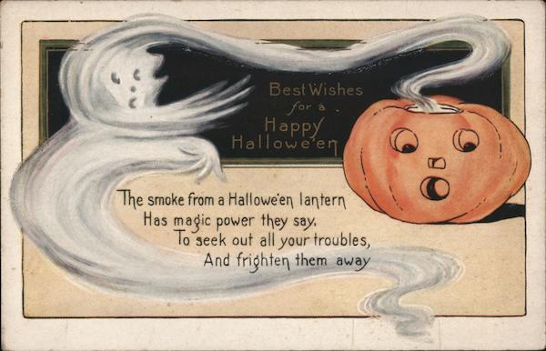 Front: Best Wishes for a Happy Hallowe'en The smoke from a Hallowe'en lantern Has magic power they say, To seek out all your troubles, And frighten them away Back: Whitney Made ADDRESS ONLY