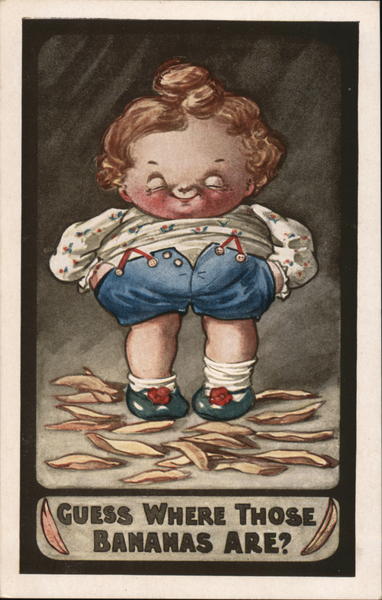 Front: GUESS WHERE THOSE BANANAS ARE? Back: Inter-Art Co., Southampton House, London, W.C. "KUTE KIDDIES" Series. No. 632. POST CARD.