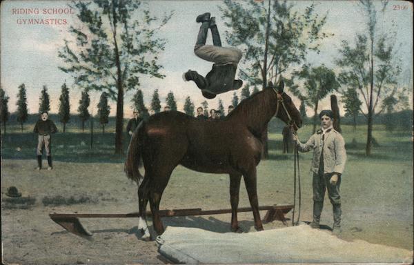 Front: RIDING SCHOOL GYMNASTICS. 2306 Back: A. C. Bosselman & Co., New York. Franklin to Arthur 25 17/13 One Cent for United States, and Island Possessions, Cuba, Canada and For Foreign. mr arthus Shove anion buy pa R.F. D. 105.