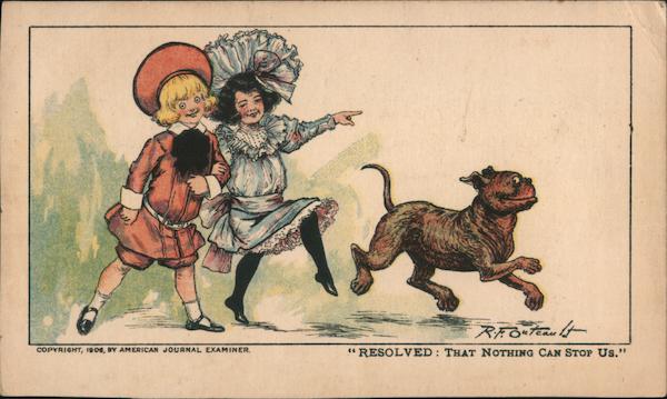 Front: COPYRIGHT, 1906, BY AMERICAN JOURNAL EXAMINER. R.F. Outcault "RESOLVED: THAT NOTHING CAN STOP US." Back: COMPLIMENTS OF LOS ANGELES SUNDAY AMERICAN OUTCAULT 649 lc. for United States and Canada; 2c. for abroad