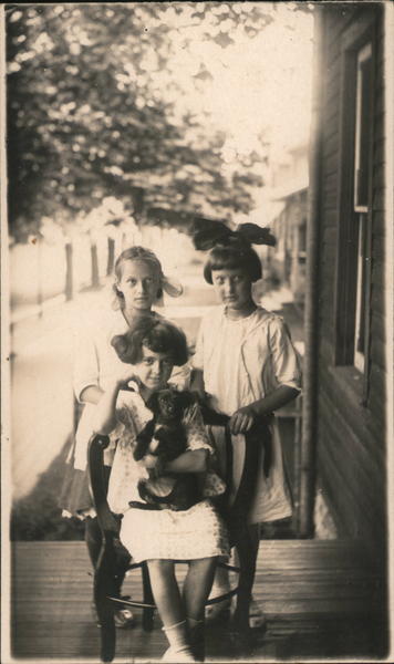 A photo of three girls. Two of the girls are standing behind a chair and the third girl is sitting in the chair holding a puppy.