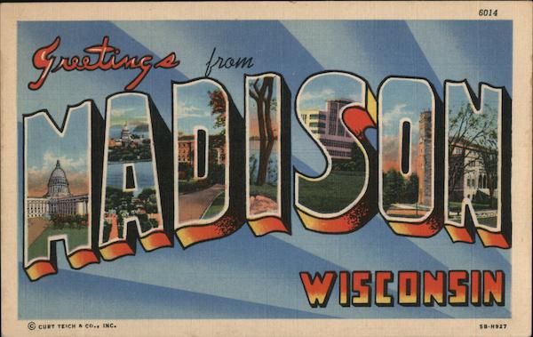 Front: 6014 Greetings from MADISON CCURT TEICH & CO., INC. WISCONSIN 5B-H927 Back: BISHOP POST CARD CO.. RACINE, WISCONSIN. "C.T.ART-COLORTONE REG. U.S. PAT. OFF PLACE
