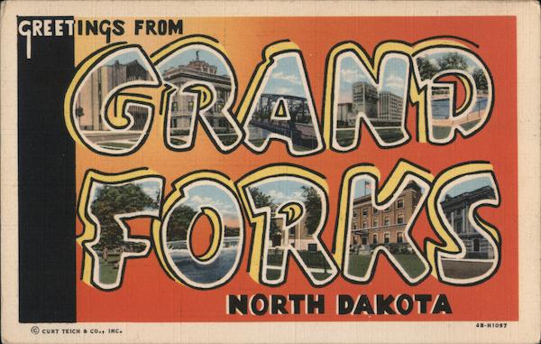 Front: THIOP GREETINGS FROM EQUENCE GRAND FORMS NORTH DAKOTA CURT TEICH & CO., INC. 4B-H1097 Mohu Back: IRA GAULKE NEWS AGENCY, GRAND FORKS, N. DAK. GENUINE CURTEICH-CHICAGO "C.T. ART-COLORTONE" POST CARD (REG.U.S. PAT. OFF.) PLACE