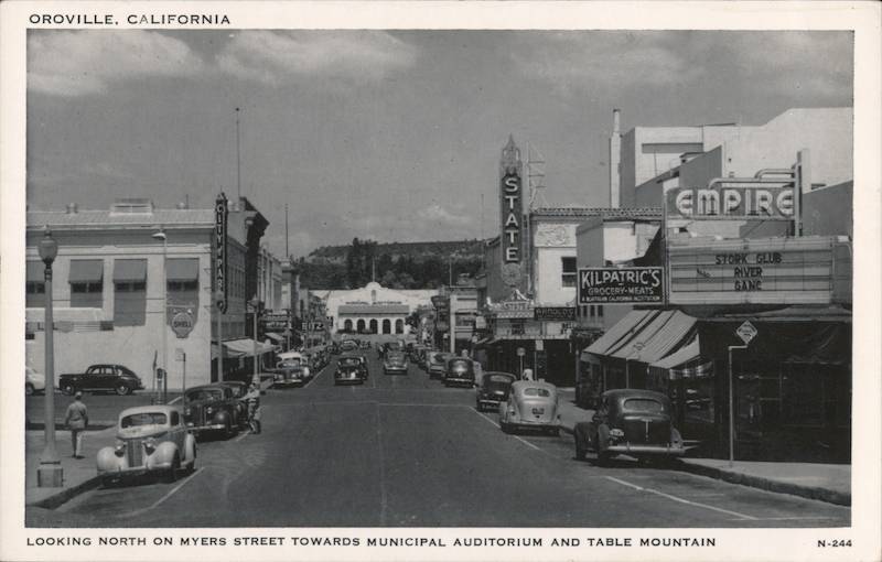 Front: OROVILLE, CALIFORNIA (181 Fuzn ARNOLDS KILPATRIC'S EMPIRE STORK CLUB RIVER GANC LOOKING NORTH ON MYERS STREET TOWARDS MUNICIPAL AUDITORIUM AND TABLE MOUNTAIN N-244 Back: Butte 6 DISTRIBUTED BY KELLY'S, OROVILLE, CALIFORNIA CLEAR VIEW HERE
