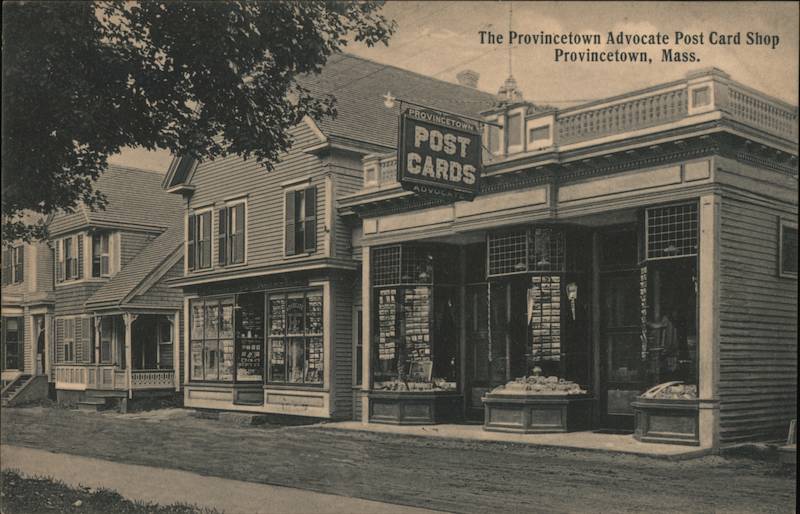 Front: OVOCATE POST CARO MATE SHOP PROVINCETOWN The Provincetown Advocate Post Card Shop Provincetown, Mass. CARDS ADVOCATE PRETINGET T*** Back: No. 972. Pub. by The Advocate, Provincetown, Mass. Dost Card. For Correspondence. A 81/26