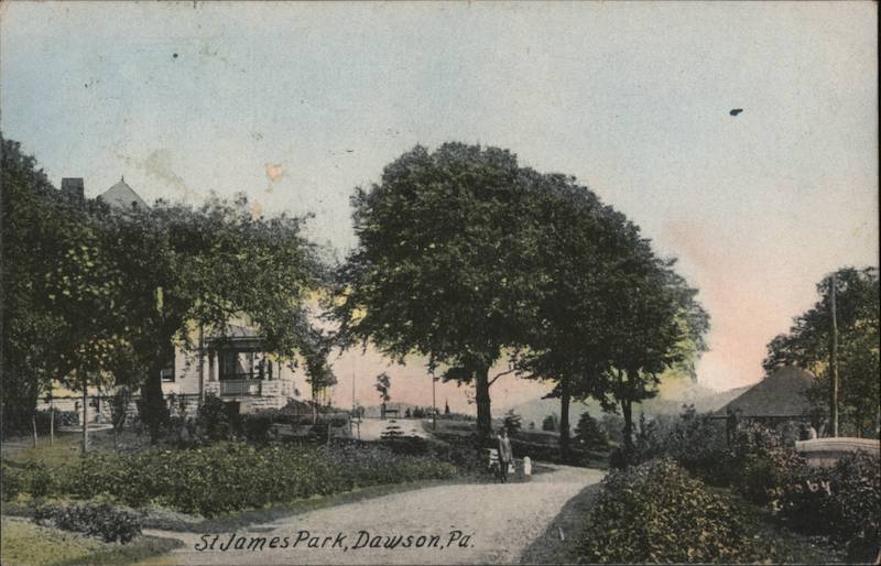 Front: St James Park, Dawson, Pa by Back: POST CARDA next our le Will me ti-chat Bo.. It avs will it 10m жетел ooo- ONLY. NA 1706 FRANKLIN 1790 me at Trontman Butter Pa n main 1