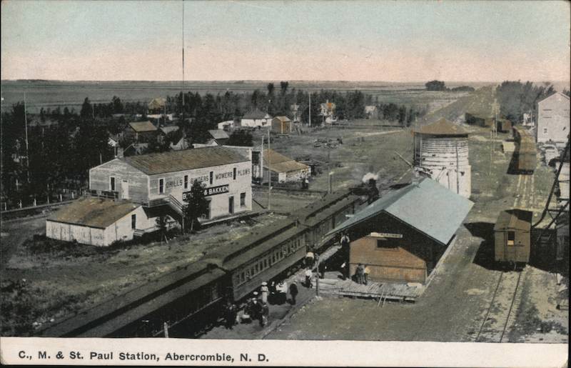 Front: DRILLS BINDERS MOWERS PLOWS & BAKKEN LL C., M. & St. Paul Station, Abercrombie, N. D. Back: THIS SPACE MAY BE USED FOR COMMUNICATION. HERE