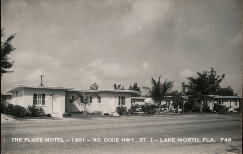 Front: PLACES THE PLACE MOTEL -- 1601 -- NO. DIXIE HWY., RT. 1- LAKE WORTH, FLA. F48 Back: ممتنى cw DEVOLITE PEERLESS Genuine EASTERN ILLUSTRATING & PUBLISHING CO., BELFAST, MAINE ALL REPRODUCTION RIGHTS RESERVED