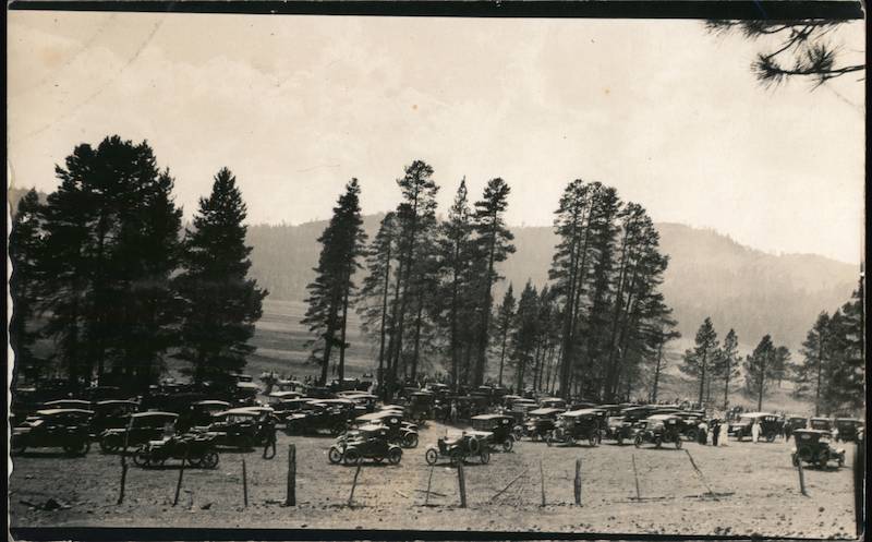 There are many antique cars parked on a field, with a mountain view and trees on the back
