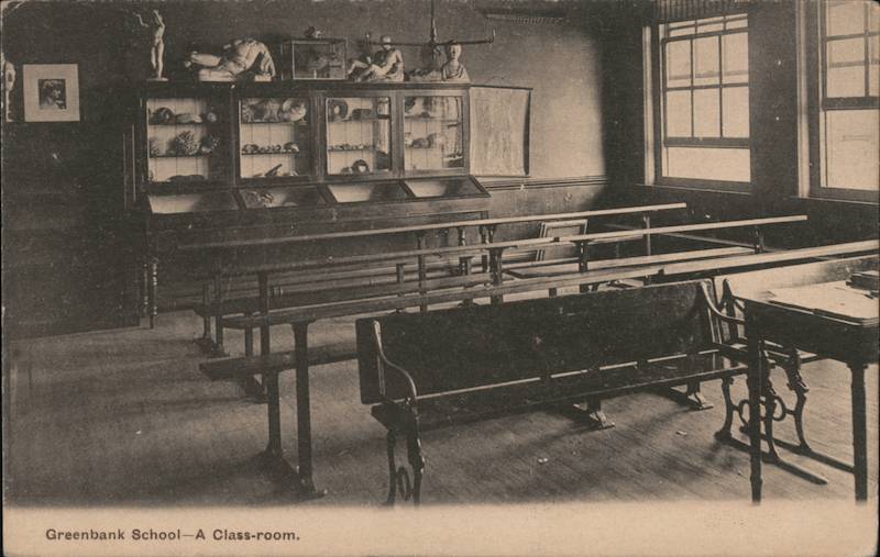 Front: Greenbank School-A Class-room. MER FR Back: Write here for Inland Postage only. STAMP. HALFPENNY POST CARD.