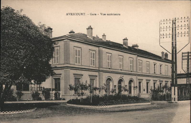 Front: AVRICOURT. - Gare Vue extérieure BA RICOU Back: IGNEY-AVRICOURT urainf 34 Fery Ph ſimater Ent 9. ilway ****** Qoût 1984 Rineez roues عوام 1