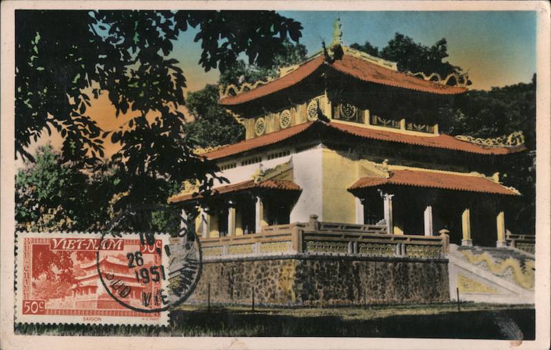 Front: BILLET BUDICHIN 50c VET-No Dục 26 1951 VE SAIGON H.-V. PARIS MONIONIC The p OSTOS STRA 51 Back: 115 SUD VIETNAM SAIGON - Jardin Botanique Pagode du Souvenir MADE IN FRANCE Cliché Agence des Colonies P-C PHOTOGRAPHIE VÉRITABLE 30 1393