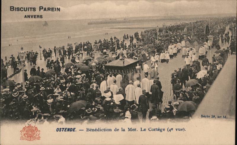 Front: BISCUITS PAREIN ANVERS OSTENDE. - Bénédiction de la Mer. Le Cortège (4e vue). Série 38, no 51. Back: IMAGE ARTISTIQUE POSTKAART ୧୭୫ St Of FORCE 259/23 POSTKAART (Côté réservé à l'adresse Zijde voor het adres alleen.)