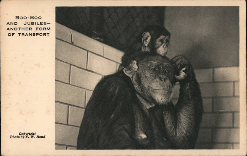 Front: Boo-Boo AND JUBILEE- ANOTHER FORM OF TRANSPORT Copyright Photo by F. W. Bond Back: From the Gardens of the Zoological Society of London, Regent's Park, N.W. COMMUNICATION England in Printed