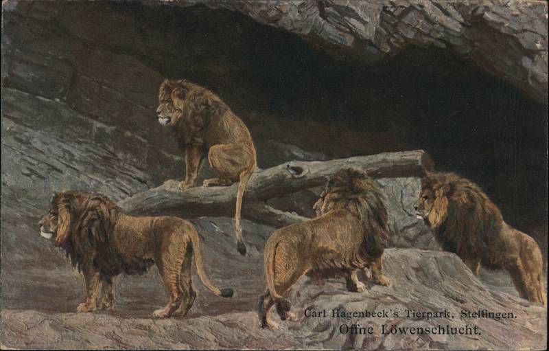 Front: Carl Hagenbeck's Tierpark, Stellingen. Offne Löwenschlucht, Back: Carl Hagenbeck's Eigentum u. Verlag. Nachdruck verboten Carl Hagenbeck's Tierpark, Stellingen. Offne Löwenschlucht. Postkarte. 94. 14.